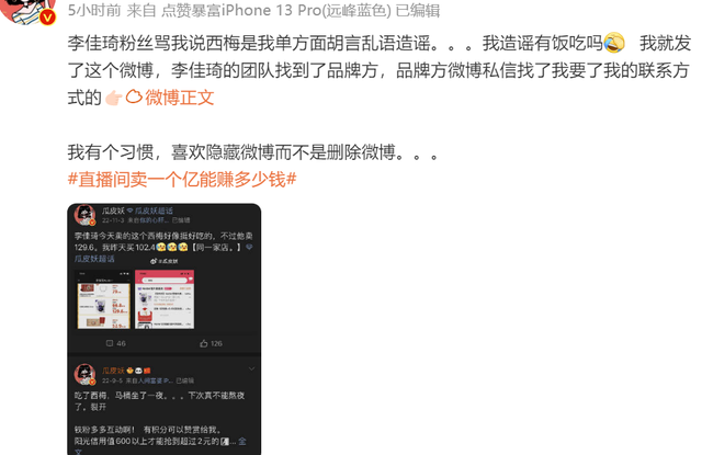 由此看来,李佳琦方除了被质疑打压同业,不让别东谈主卖廉价除外,对品牌方也很不客气。博主还爆料称我方买西梅发现比李佳琦直播间低廉,就发文共享了一下,遵守西梅的品牌方哭着打电话求博主删帖,否则公司都会被李佳琦告到歇业。可见李佳琦在居品订价问题上的把控以致拓展到所有这个词这个词破钞商场,他必须是“全网最低”,为了这一句标语,说什么他都得是最廉价,谁比他低廉,不是投诉即是告状。