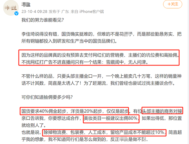 除此除外,也有其他品牌发长文控诉头部主播,爆料称直播带货国货色牌方要出佣40%给主播,头部主播要80%的佣金,什么观点?也即是撤离一些必需的用度,居品本钱不行跳跃10%,要否则品牌方每卖一笔都是在赔钱。